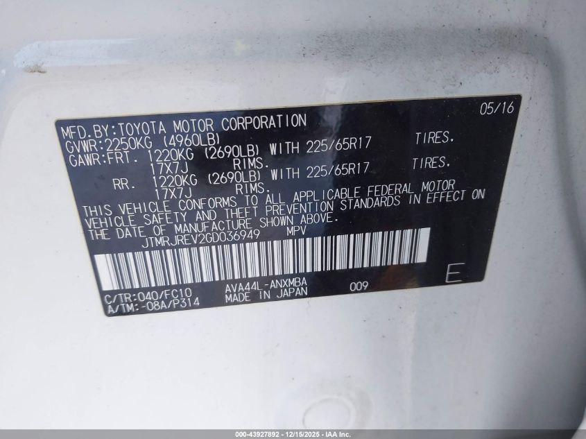 Колір БілийЦиліндри 4Привід Повний привідVIN JTMRJREV2GD036949Стан СтаціонарноУшкодження Передня або задня