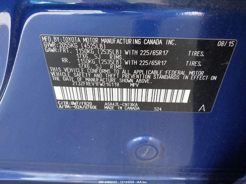 2015 TOYOTA RAV4 - 2T3ZFREV1FW216118, колір - Синій, 2.5, Бензин, Передній привід із США