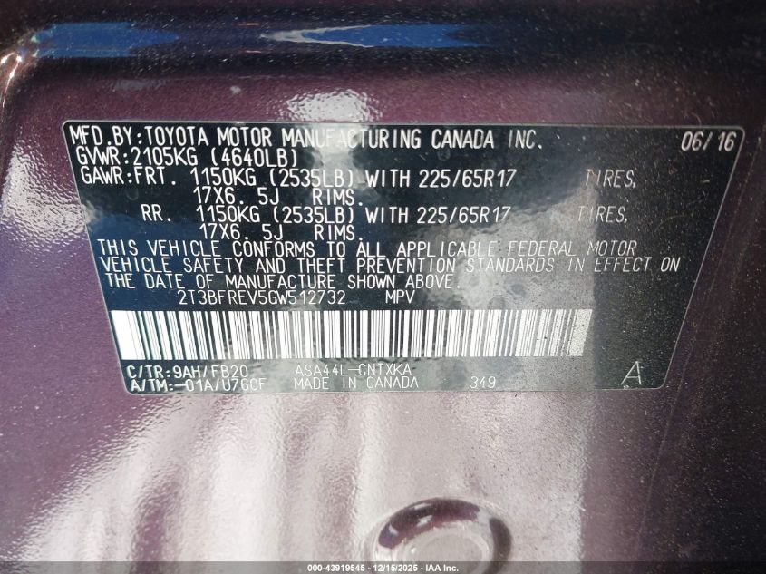Колір ФіолетовийЦиліндри 4Привід Повний привідVIN 2T3BFREV5GW512732Стан Заводиться та їде (перевірено)Ушкодження Передня або задня