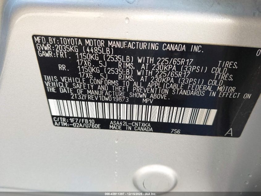 Колір СрібнийЦиліндри 4Привід Передній привідVIN 2T3ZFREV1DW019673Стан Заводиться та їде (перевірено)Ушкодження Ліва сторона