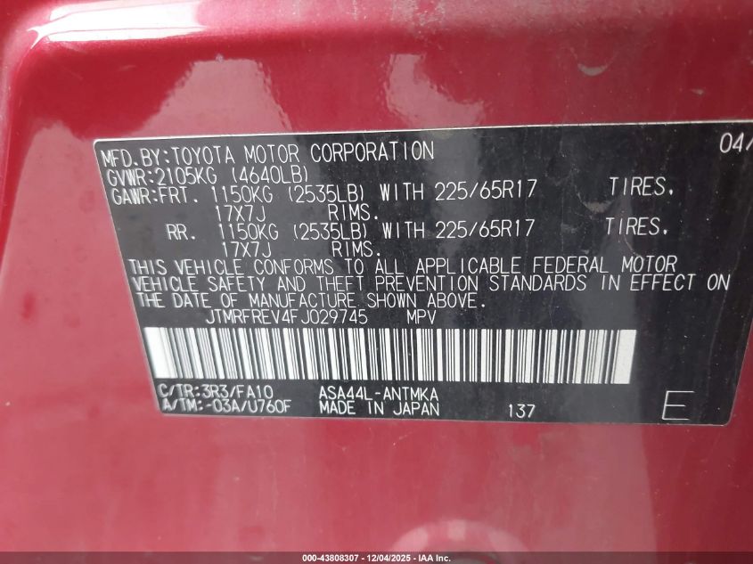 Колір ЧервонийЦиліндри 4Привід Повний привідVIN JTMRFREV4FJ029745Стан СтаціонарноУшкодження Передня праваДата аукціона 2025-12-17