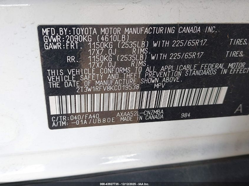 2019 TOYOTA RAV4 - 2T3W1RFV8KC019538, колір - Білий, 2.5, Бензин, Передній привід із США