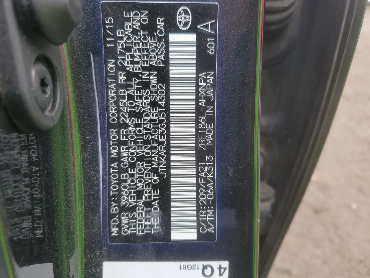 Колір ЧорнийЦиліндри 4VIN JTNKARJE3GJ514302Стан Заводиться та їде (перевірено)Ушкодження ЗадняДата аукціона 2025-10-09