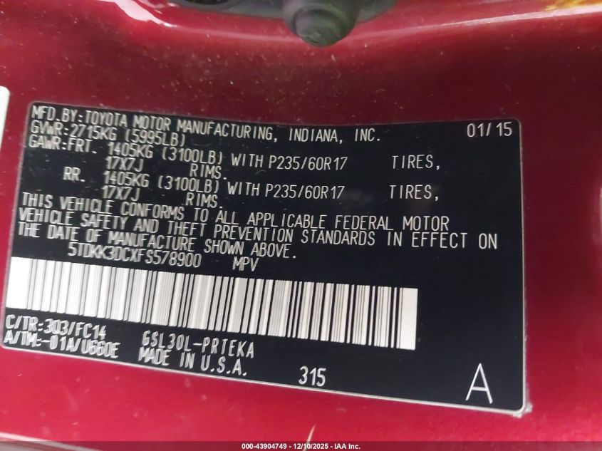 2015 TOYOTA SIENNA - 5TDKK3DCXFS578900, колір - Червоний, 3.5, Бензин, Передній привід із США