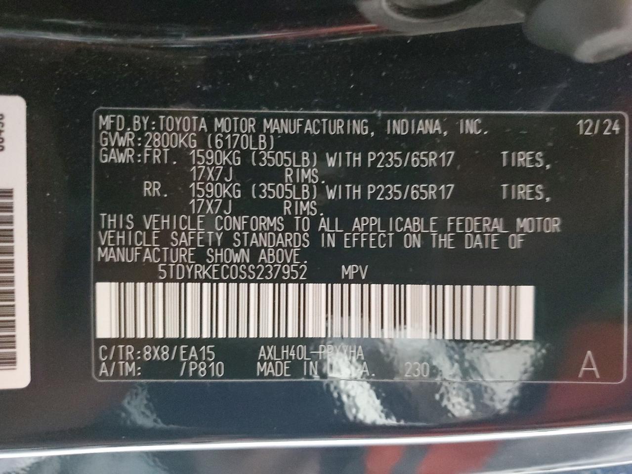 Колір СинійЦиліндри 4VIN 5TDYRKEC0SS237952Стан НевідомоУшкодження Передня або задня