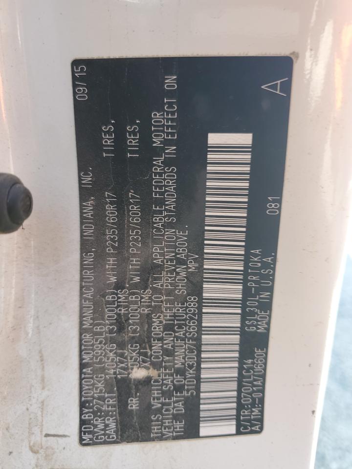 2015 TOYOTA SIENNA - 5TDYK3DC7FS662988, колір - Білий, 3.5, Бензин, із США