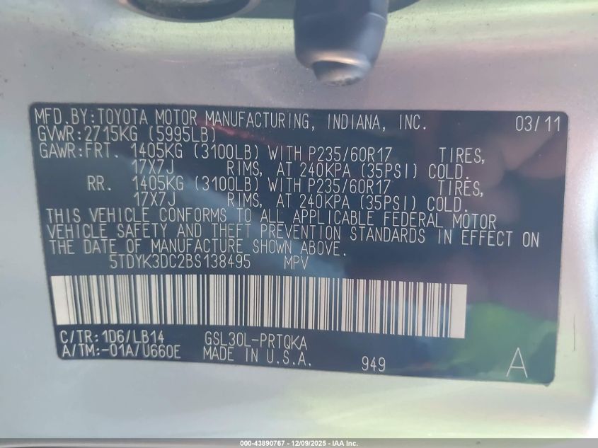 2011 TOYOTA SIENNA - 5TDYK3DC2BS138495, колір - Срібний, 3.5, Бензин, Передній привід із США