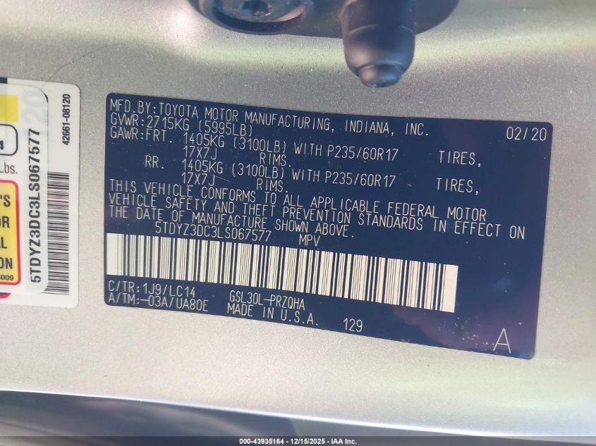 2020 TOYOTA SIENNA - 5TDYZ3DC3LS067577, колір - Срібний, 3.5, Бензин, Передній привід із США