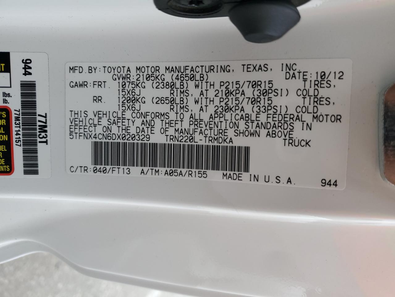 Колір БілийЦиліндри 4Привід Задній привідVIN 5TFNX4CN6DX020329Стан Заводиться та їде (перевірено)Ушкодження Передня або задня