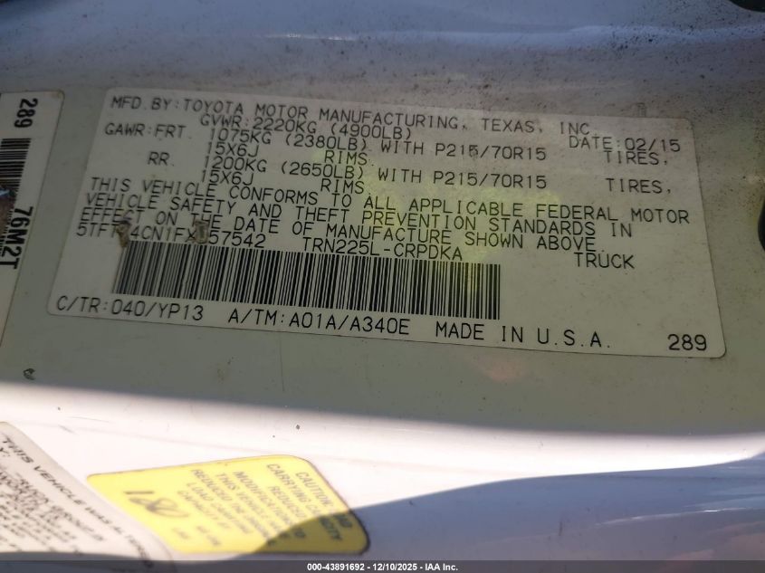 2015 TOYOTA TACOMA - 5TFTX4CN1FX057542, колір - Білий, 2.7, Бензин, із США