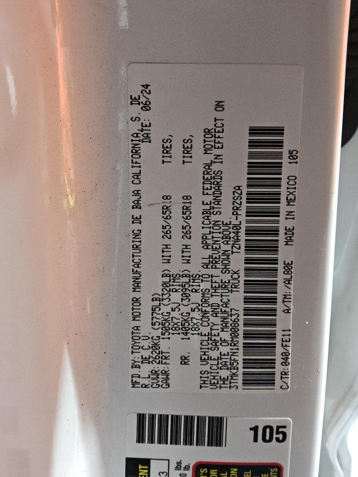 2024 TOYOTA TACOMA - 3TMKB5FN1RM008637, колір - Білий, 2.4, Бензин, Задній привід із США