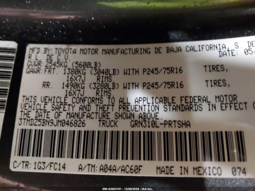 Колір СірийЦиліндри 6Привід Повний привідVIN 3TMDZ5BN9JM046826Стан Заводиться та їде (перевірено)Ушкодження Передня або задня