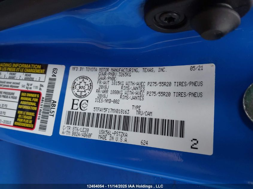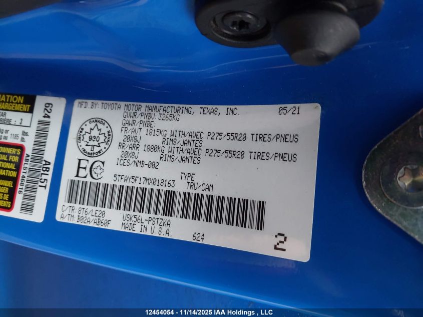 2021 TOYOTA TUNDRA - 5TFAY5F17MX018163, колір - Синій, , Бензин, Повний привід із США