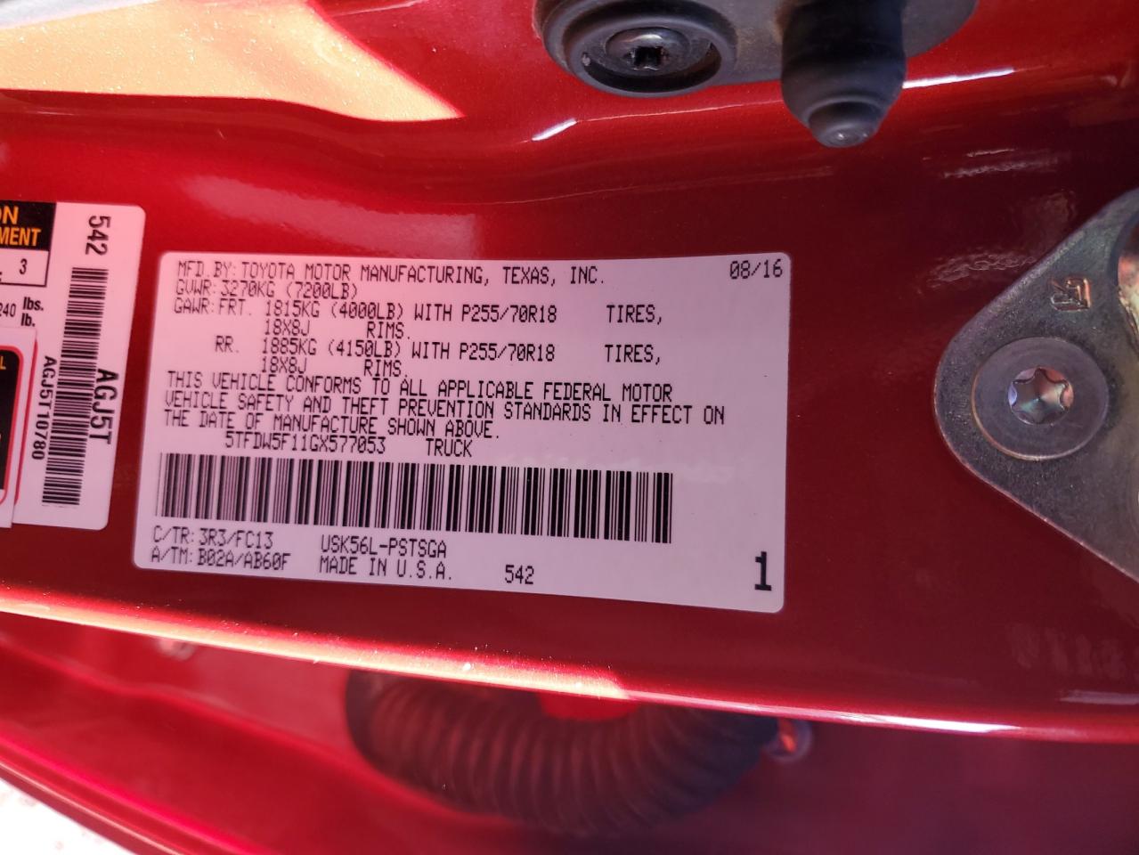 2016 TOYOTA TUNDRA - 5TFDW5F11GX577053, колір - Червоний, 5.7, Бензин, 4x4 з заднім приводом із США