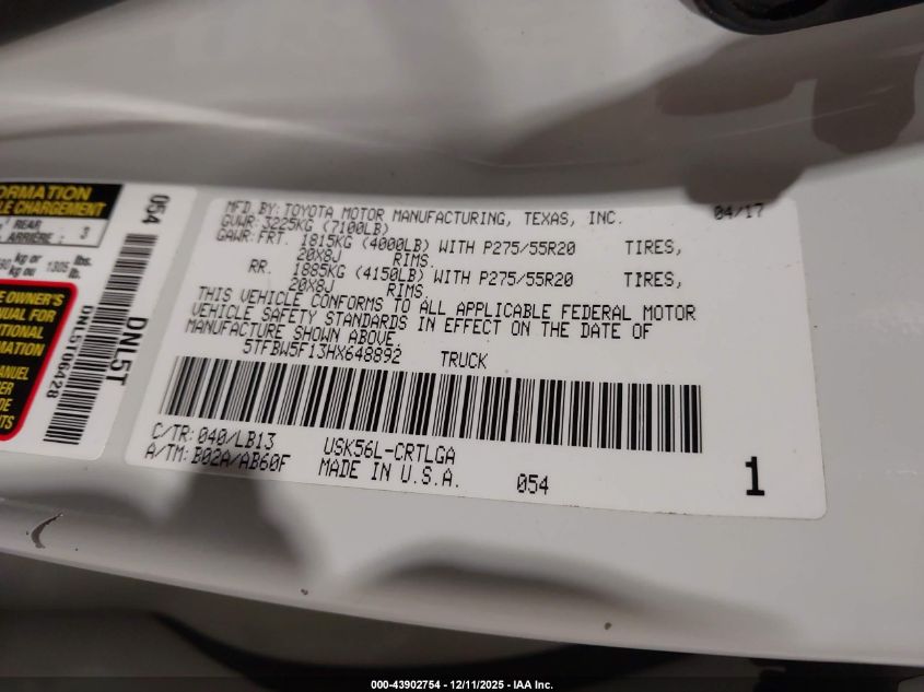 2017 TOYOTA TUNDRA - 5TFBW5F13HX648892, колір - Білий, 5.7, Бензин, Повний привід із США
