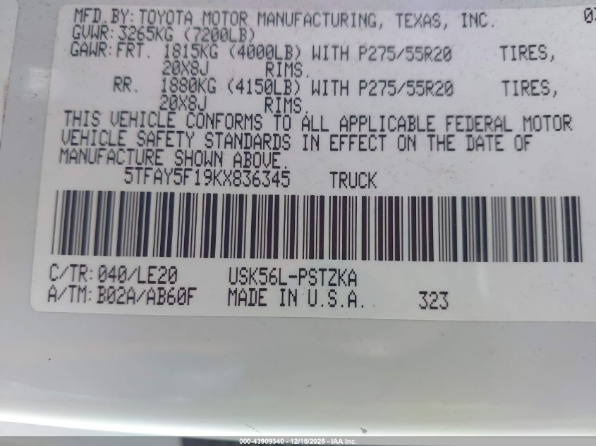 2019 TOYOTA TUNDRA - 5TFAY5F19KX836345, колір - Білий, 5.7, Бензин, Повний привід із США