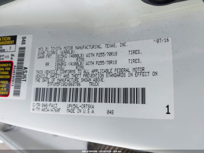 2016 TOYOTA TUNDRA - 5TFUM5F10GX068786, колір - Білий, 4.6, Бензин, Повний привід із США