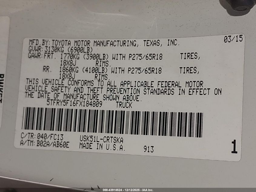 2015 TOYOTA TUNDRA - 5TFRY5F16FX184809, колір - Білий, 5.7, Бензин, із США