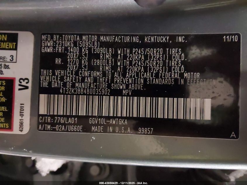 2011 TOYOTA VENZA - 4T3ZK3BB4BU035902, колір - Синій, 3.5, Бензин, Передній привід із США