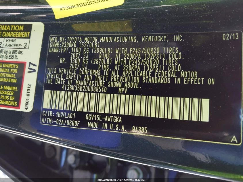 2013 TOYOTA VENZA - 4T3BK3BB2DU088540, колір - Чорний, 3.5, Бензин, Повний привід із США