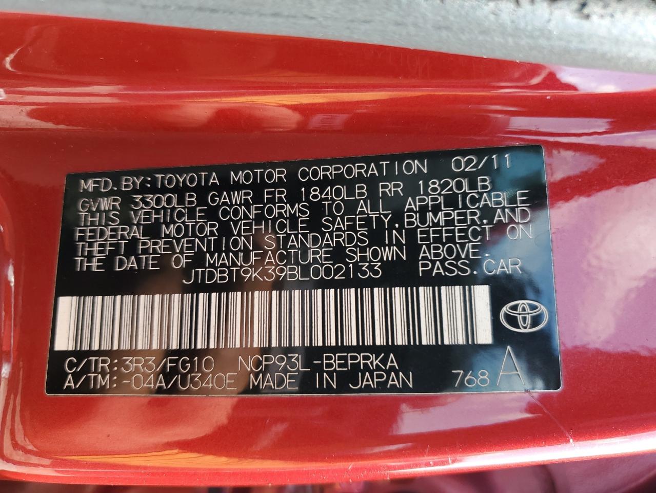 Колір ЧервонийЦиліндри 4VIN JTDBT9K39BL002133Стан НевідомоУшкодження З боківДата аукціона 2025-10-08