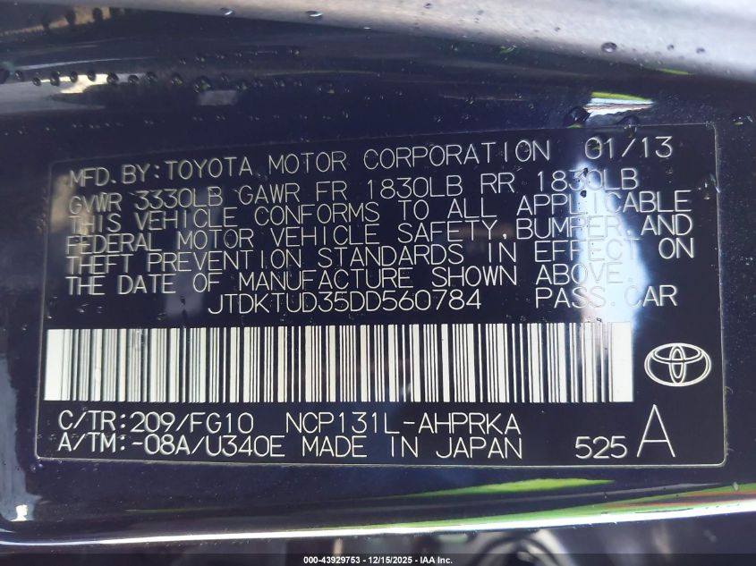 Колір Циліндри 4Привід Передній привідVIN JTDKTUD35DD560784Стан НевідомоУшкодження Невідомо
