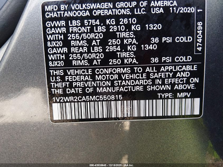 2021 VOLKSWAGEN ATLAS - 1V2WR2CA5MC550815, колір - Сірий, 3.6, Бензин, Передній привід із США
