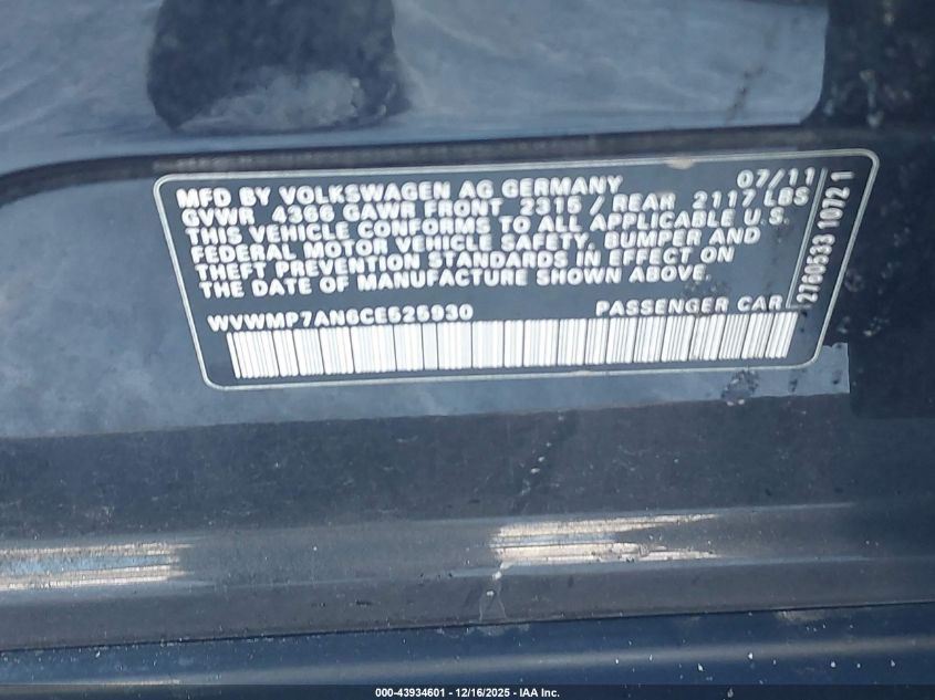 2012 VOLKSWAGEN CC - WVWMP7AN6CE525930, колір - , 2.0, Бензин, Передній привід із США