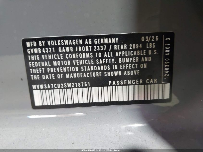 2025 VOLKSWAGEN GOLF GTI - WVW3A7CD2SW218751, колір - Сірий, 2.0, Бензин, Передній привід із США