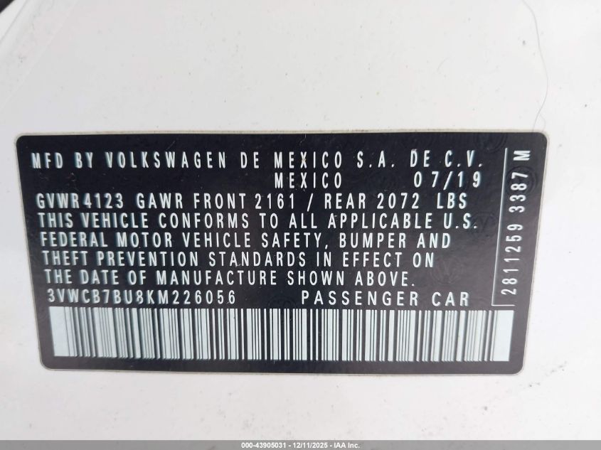 2019 VOLKSWAGEN JETTA - 3VWCB7BU8KM226056, колір - Білий, 1.4, Бензин, Передній привід із США