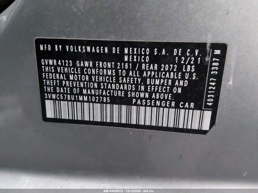 2021 VOLKSWAGEN JETTA - 3VWC57BU1MM102785, колір - Срібний, 1.4, Бензин, Передній привід із США