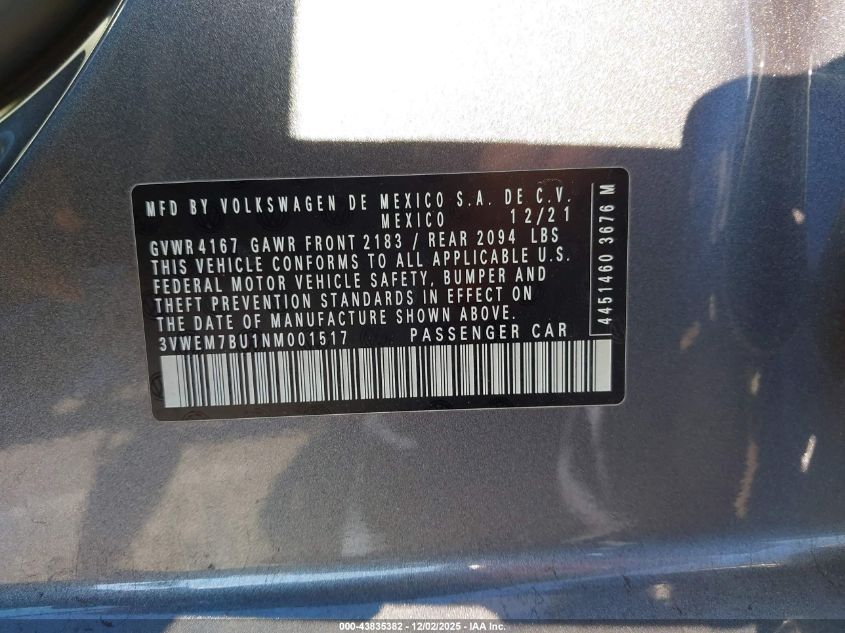 2022 VOLKSWAGEN JETTA - 3VWEM7BU1NM001517, колір - Сірий, 1.5, Бензин, Передній привід із США