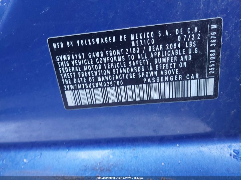 2022 VOLKSWAGEN JETTA - 3VW7M7BU2NM026760, колір - Синій, 1.5, Бензин, Передній привід із США