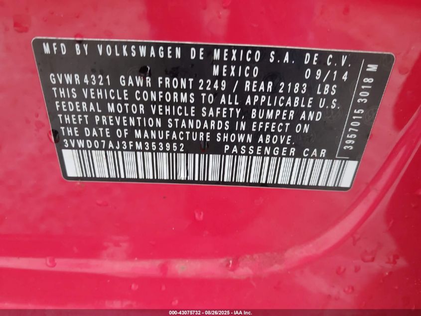 2015 VOLKSWAGEN JETTA - 3VWD07AJ3FM353952, колір - Червоний, 1.8, Бензин, Передній привід із США