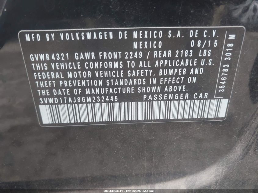 2016 VOLKSWAGEN JETTA - 3VWD17AJ8GM232445, колір - Чорний, 1.8, Бензин, Передній привід із США