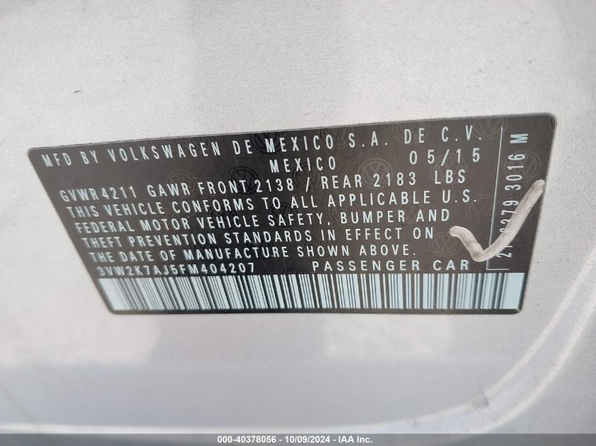 2015 VOLKSWAGEN JETTA - 3VW2K7AJ5FM404207, колір - Срібний, 2.0, Бензин, Передній привід із США