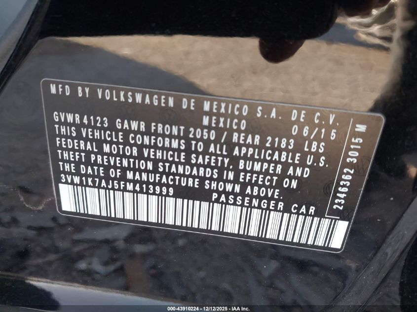 2015 VOLKSWAGEN JETTA - 3VW1K7AJ5FM413999, колір - Чорний, 2.0, Бензин, Передній привід із США