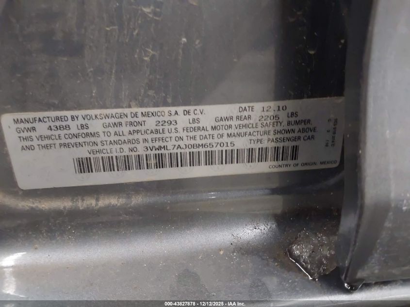 2011 VOLKSWAGEN JETTA - 3VWML7AJ0BM657015, колір - Сірий, 2.0, Дизель, Передній привід із США