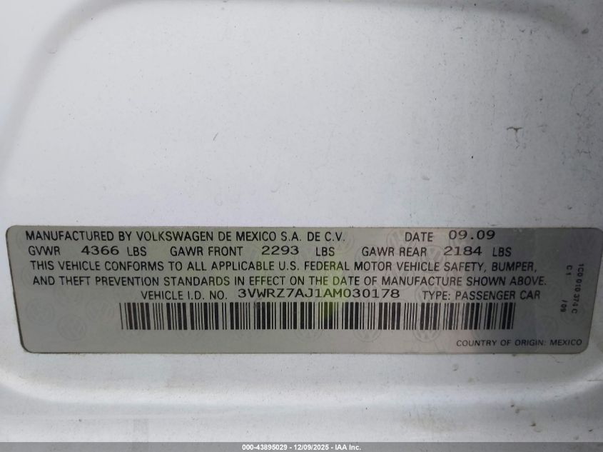 2010 VOLKSWAGEN JETTA - 3VWRZ7AJ1AM030178, колір - Білий, 2.5, Бензин, Передній привід із США