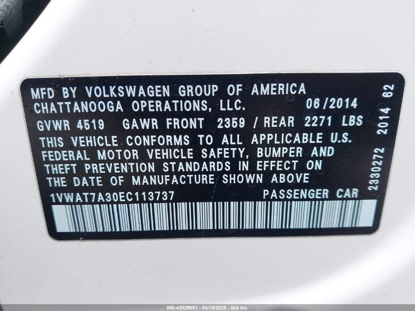 2014 VOLKSWAGEN PASSAT - 1VWAT7A30EC113737, колір - Білий, 1.8, Бензин, Передній привід із США
