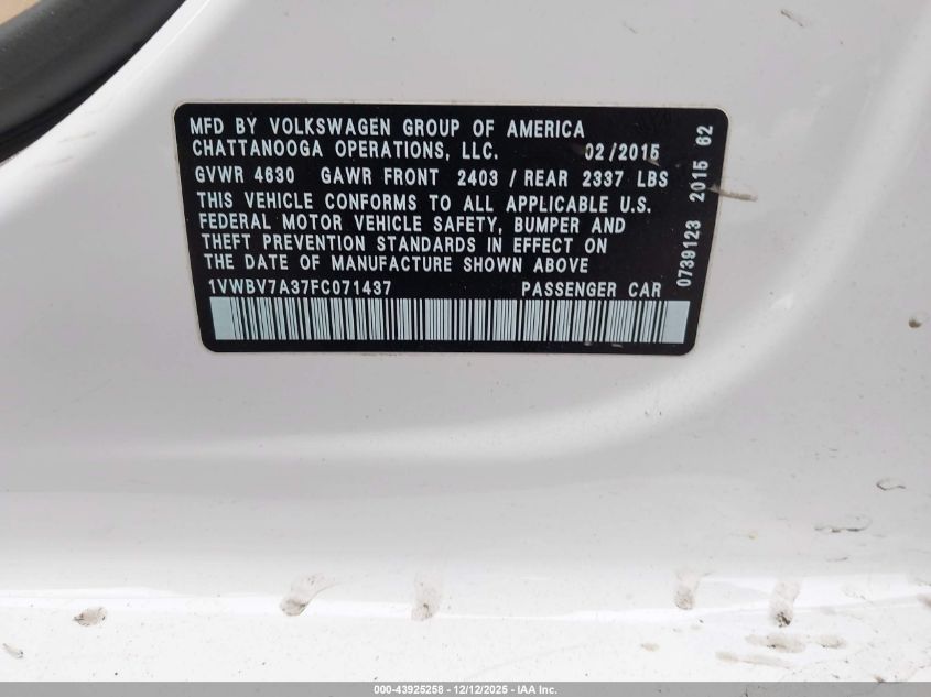 2015 VOLKSWAGEN PASSAT - 1VWBV7A37FC071437, колір - Білий, 2.0, Дизель, Передній привід із США