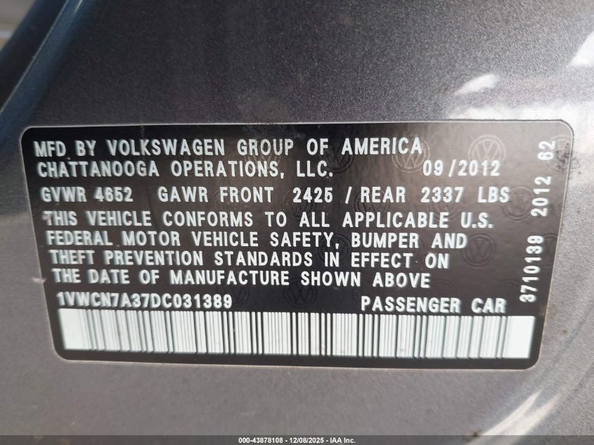 2013 VOLKSWAGEN PASSAT - 1VWCN7A37DC031389, колір - Сірий, 2.0, Дизель, Передній привід із США