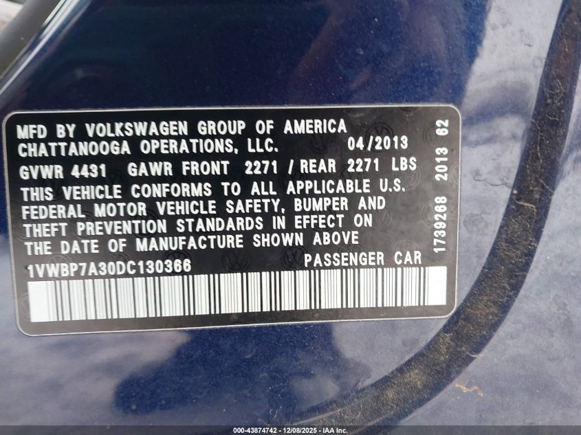 2013 VOLKSWAGEN PASSAT - 1VWBP7A30DC130366, колір - Синій, 2.5, Бензин, Передній привід із США
