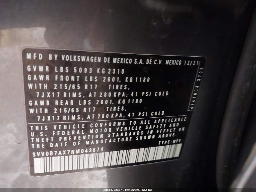 2022 VOLKSWAGEN TIGUAN - 3VV0B7AX7NM043674, колір - Сірий, 2.0, Бензин, Повний привід із США