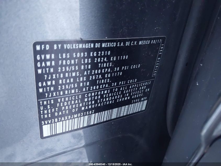 2018 VOLKSWAGEN TIGUAN - 3VV2B7AX9JM031562, колір - Сірий, 2.0, Бензин, Повний привід із США