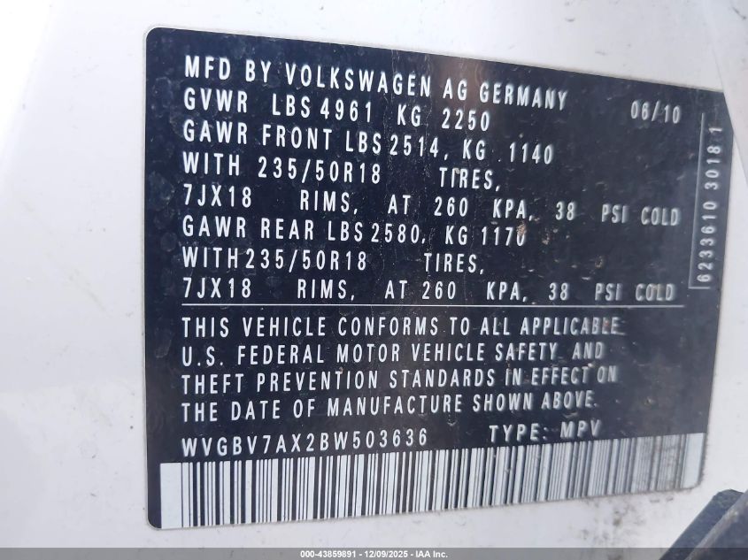 Колір БілийЦиліндри 4Привід Повний привідVIN WVGBV7AX2BW503636Стан СтаціонарноУшкодження Звичайний зносДата аукціона 2025-12-17