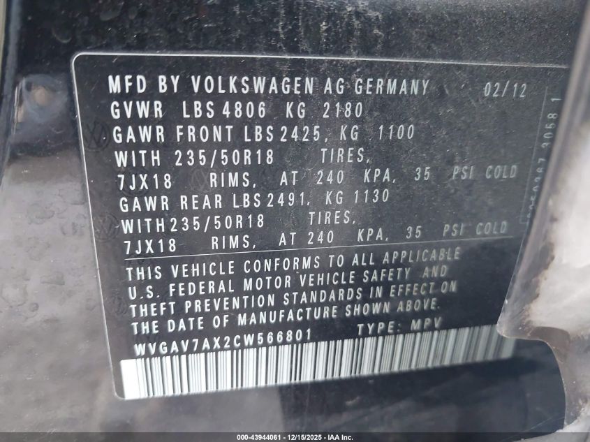 2012 VOLKSWAGEN TIGUAN - WVGAV7AX2CW566801, колір - Чорний, 2.0, Бензин, Передній привід із США