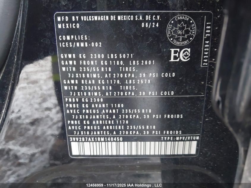 2024 VOLKSWAGEN TIGUAN - 3VV2B7AX1RM140450, колір - Чорний, , Бензин, Повний привід із США