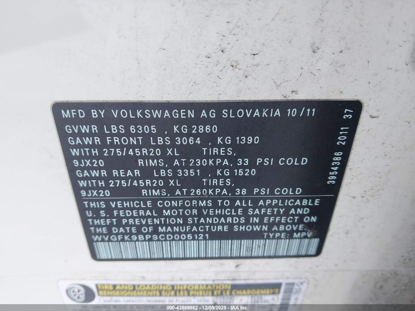 Колір БілийЦиліндри 6Привід Повний привідVIN WVGFK9BP8CD005121Стан СтаціонарноУшкодження Звичайний зносДата аукціона 2025-12-17