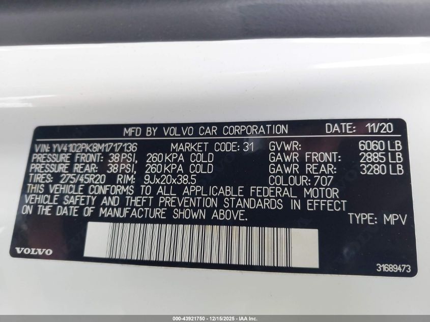 2021 VOLVO XC90 - YV4102PK8M1717136, колір - Білий, 2.0, Бензин, Повний привід із США